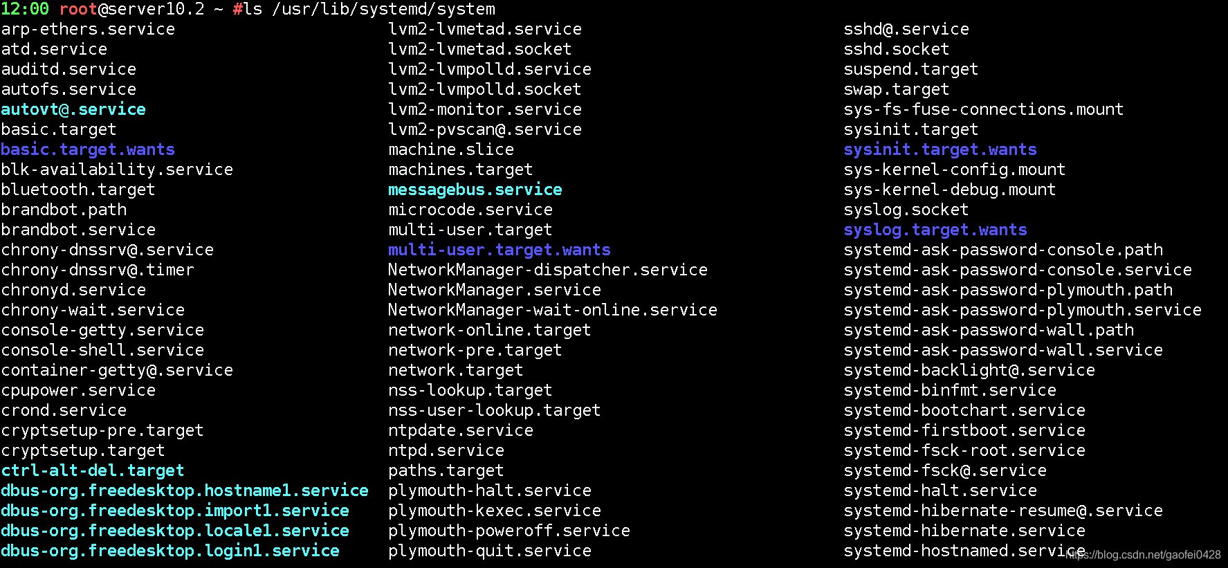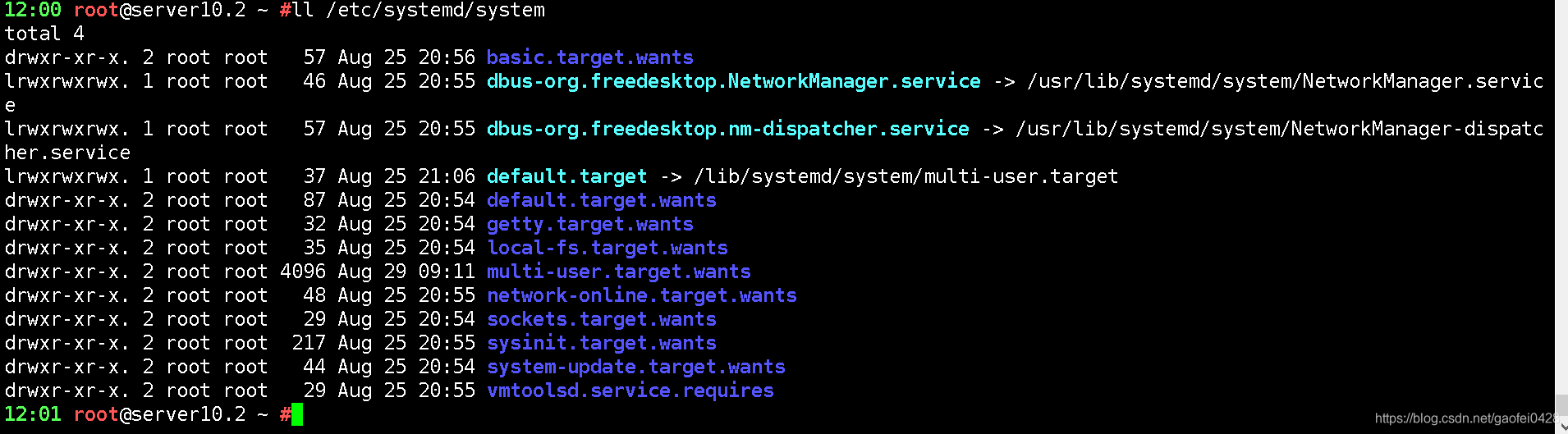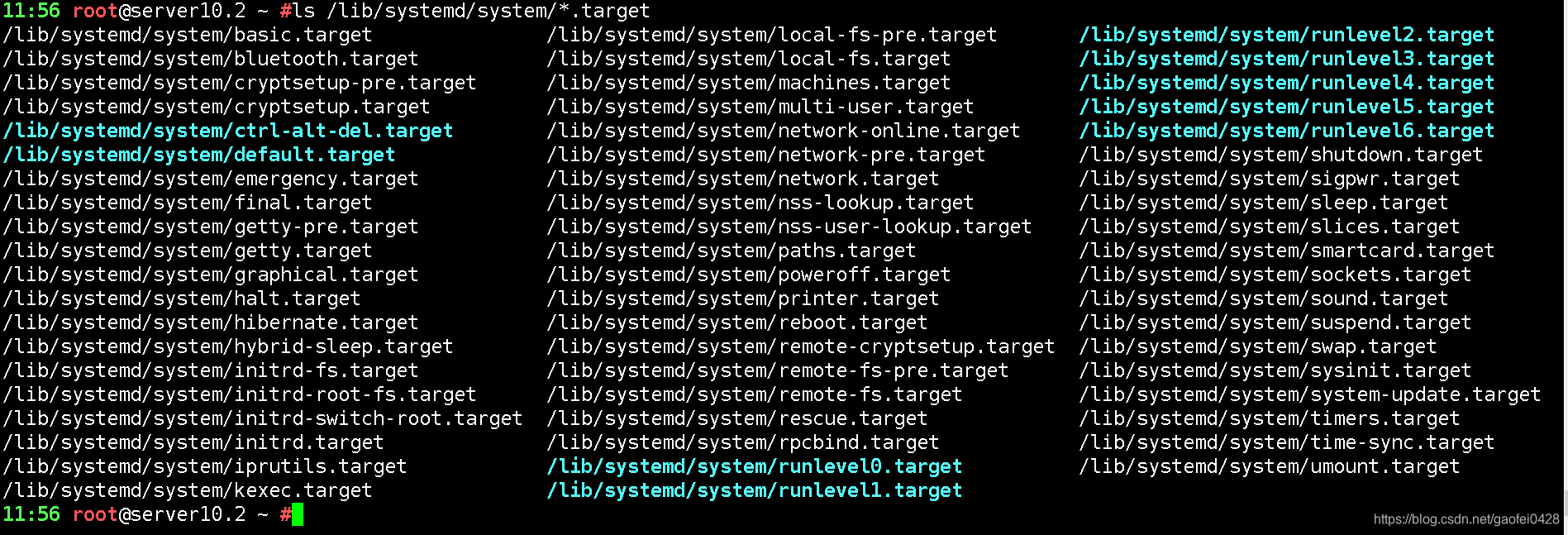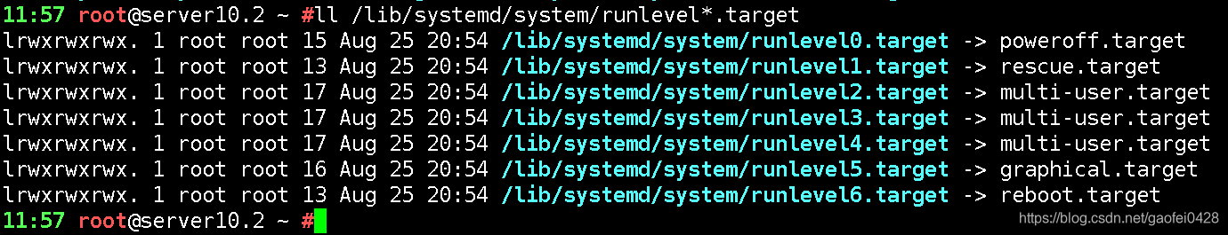 这里可以看到runlevel开头的target文件,对应着CentOS6的启动级别,不过一样是软链接,指向了同目录下的其他文件,也算一种向下兼容吧